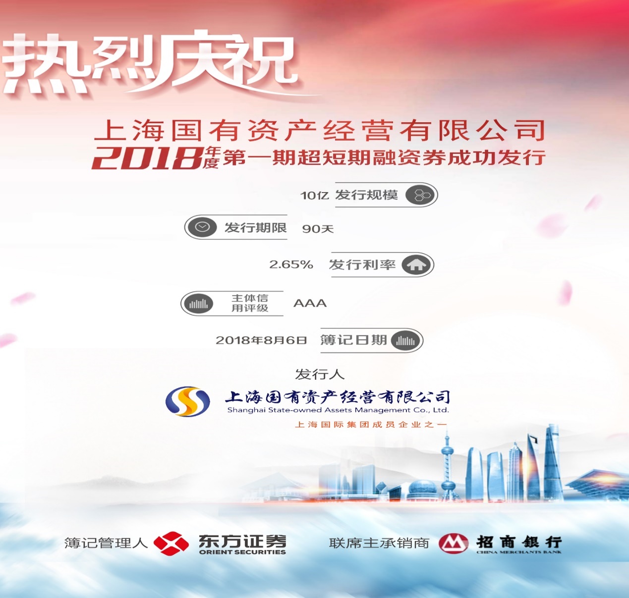上海ag真人平台官方经营有限公司2018年第一期超短融资债(SCP)于8月6日成功发行,规模10亿,信用评级AAA/AAA,期限90天,票面利率2.65%,边际倍数2.57倍,全场认购倍数4.33倍,获得了市场的广泛认可,票面利率达近年来同期限SCP全市场最低。
