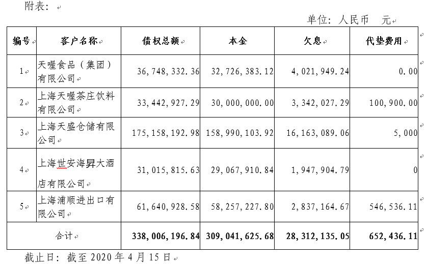 上海ag真人平台官方经营有限公司拟对从工商银行上海市分行受让的天喔食品(集团)有限公司等5户债权进行处置。详见附表。(债权信息供参考,最终以借据、合同、法院判决等有关法律资料为准。)